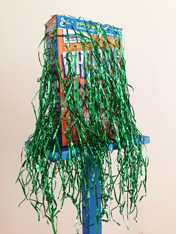 Lakers Championship Wheaties box, pom pom thingies, wood, metal, paint.